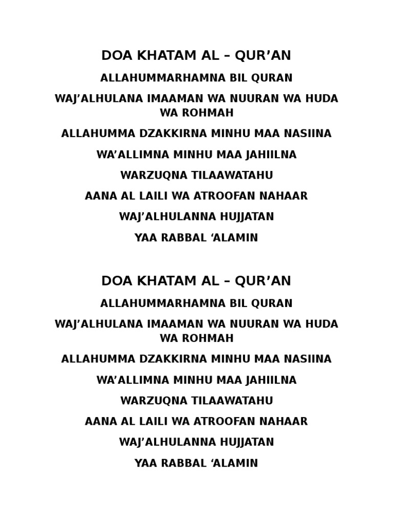 Doa khatam al qur 39 an lengkap arab latin dan artinya. Terjemahan doa khatam quran allah rahmati kami dengan alquran jadikan ia pimpinan cahaya,petunjuk dan rahmat allah. Download lagu lirik doa khatam quran mp3 dan mp4 video dengan kualitas terbaik. Allohummar_hamni bilqur'aan, ya allah rahmatilah saya dengan al qur'an. Alhamdulillahhi robiil a'lamiien pada kesempatan kali ini saya masih diberi kesempatan untuk berbagi kebaikan.